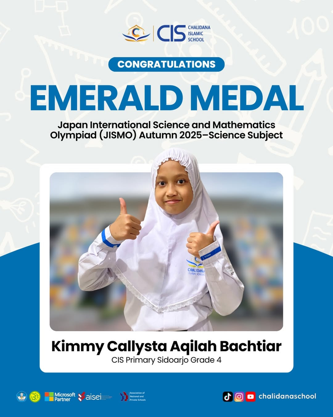 We’re so proud of Kimmy Callysta Aqilah Bachtiar, Grade 4 CIS Primary Sidoarjo, for achieving the Emerald Medal in JISMO (Japan International Science and Mathematics Olympiad) Autumn 2025 – Science Primary 4!