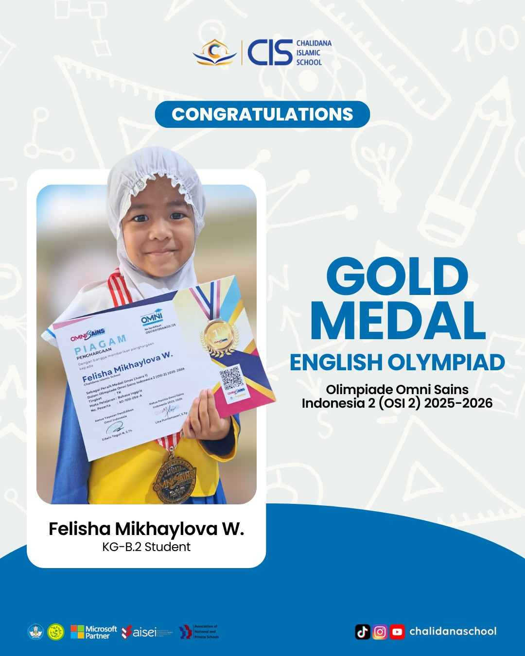 Congratulations to Felisha Mikhaylova W. from KG B.2 CIS Preschool Juanda for winning 1st Place (Gold Medal) in the English Olympiad – Olimpiade Omni Sains Indonesia 2